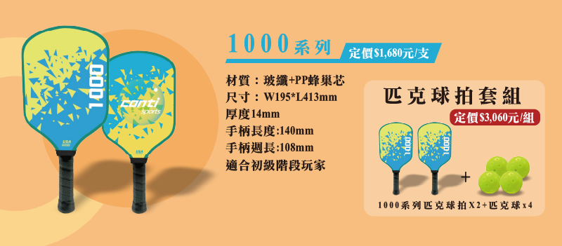 套組內容:1000系列匹克球拍X2+匹克球x4
